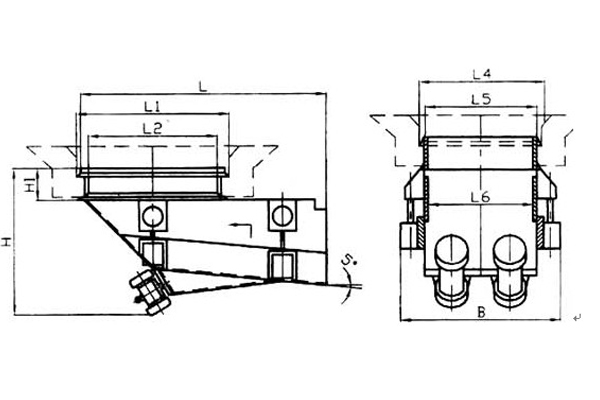 慣性振動(dòng)給煤機(jī)由機(jī)架、底板(給煤槽)、傳動(dòng)平臺(tái)、漏斗、閘門、托輥等組成。當(dāng)電機(jī)開(kāi)動(dòng)后經(jīng)彈性聯(lián)軸器、減速機(jī)、曲柄連桿機(jī)構(gòu)拖動(dòng)傾料5°的底板在輥上作直線往復(fù)運(yùn)動(dòng),煤均勻地卸到其他設(shè)備上。